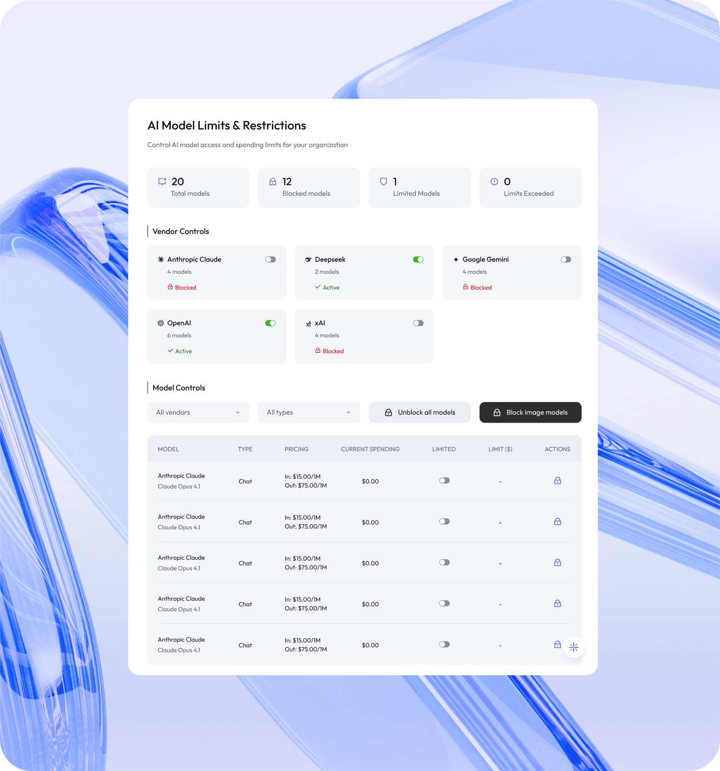 - Monitor usage, model preferences and spending in one place
