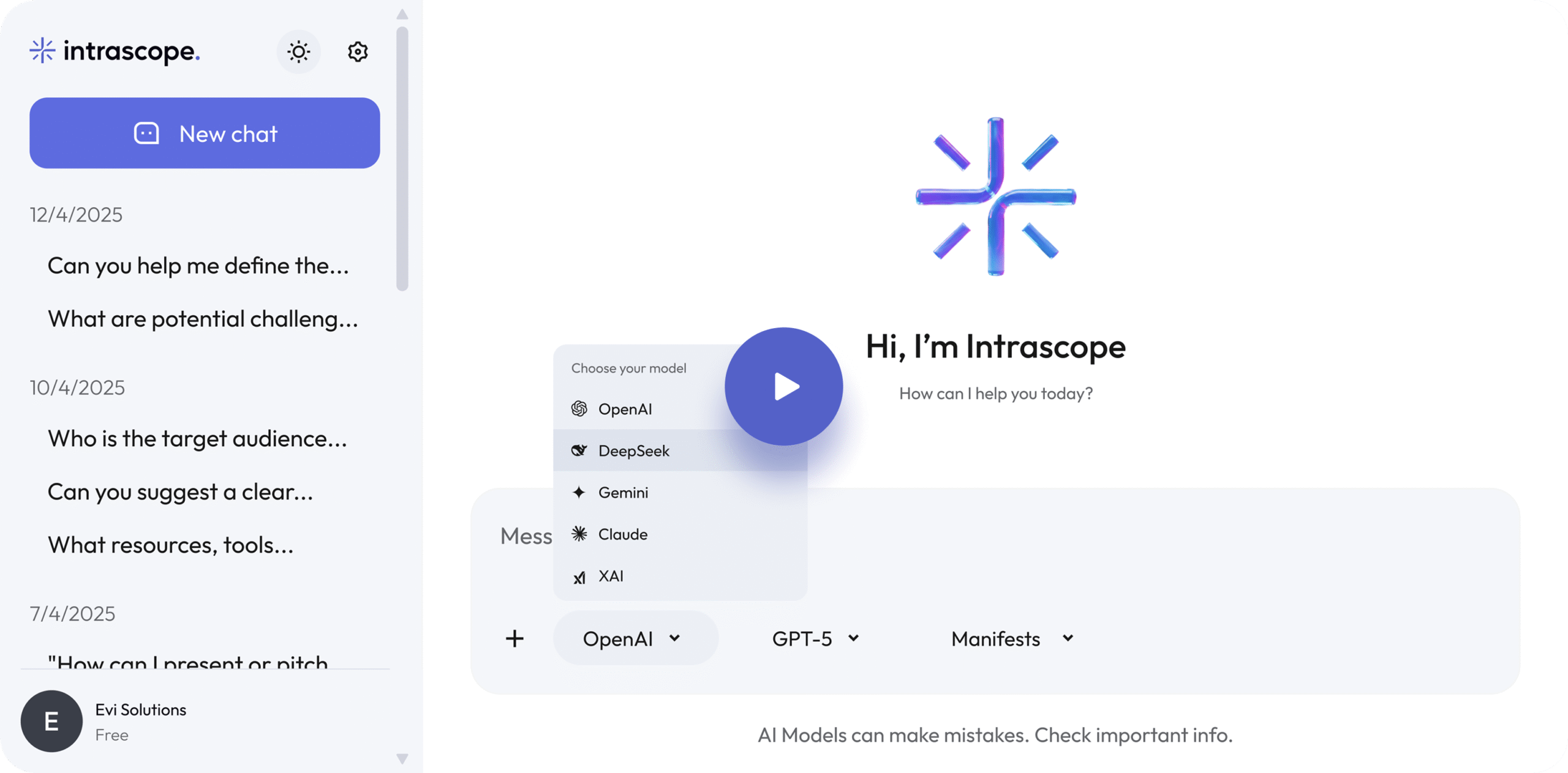 Managing AI tools across a company can quickly turn into a mess of personal accounts, disconnected prompts and scattered context. With Intrascope, your team works inside one shared and secure environment with unified access to all major language models.